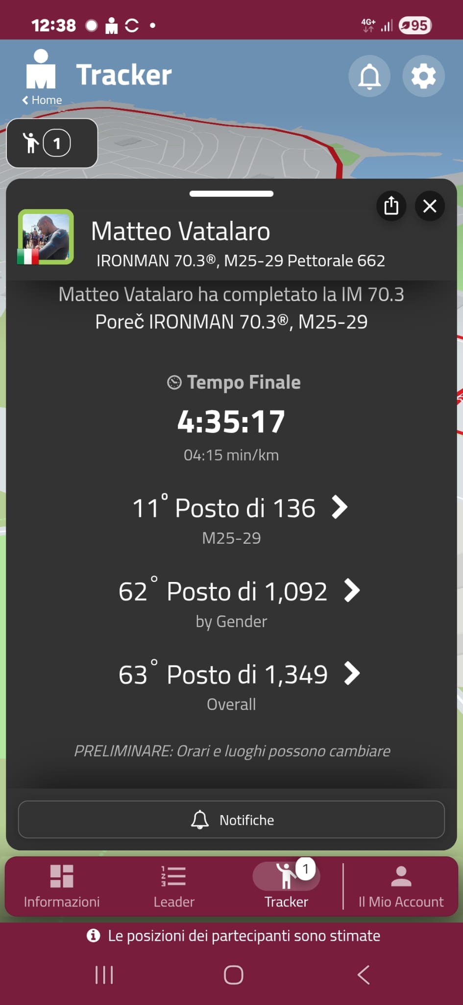 Ha concluso la gara in 4h35' classificandosi 11mo di categoria, mancando per una manciata di secondi la top ten e 62mo assoluto; tempi e prestazione di tutto rispetto per questo giovane atleta.